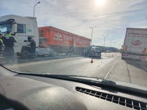 Дорожно транспортное происшествие произошло сегодня в утреннее время В ДТП с участием легковушки и большегрузов больше всего нанесен ущерб легковому автомобилю.