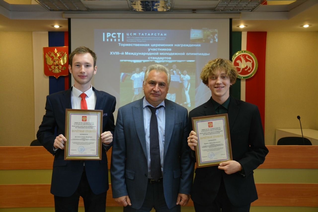 За личный вклад в развитие международной и отечественной стандартизации почетными грамотами Росстандарта награждены выпускник Республиканского инженерного лицея-интерната Уфы, студент первого курса Университета Иннополис Аскар Арсланов и студент Казанского техникума информационных технологий и связи Данил Буртов.