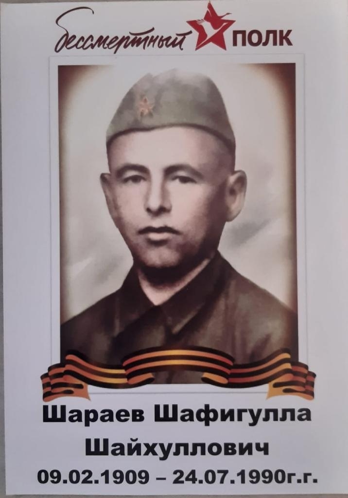 «Шараев Шафигулла родился 1909 года в Татарской АССР, Буинский р-н, д. Сорок Сайдаки. 22 сентября 1941 Шафигулла Шайхуллович со своими земляками отправился на войну. Их отправили на важный участок в Кировский фронт, воевать против финских и немецких захватчиков. Получил воинское звание: рядовой. Самое интересное то, что они все трое вернулись живыми с войны. Министром обороны СССР от 21 февраля 1987 года, Шафигулла Шайхуллович был награждён орденом Отечественной войны II степени. Реквизиты: ВК Республики Татарстан. ВК Ново-Савиновского и Авиастроительного районов г. Казани. Дело 11001526»